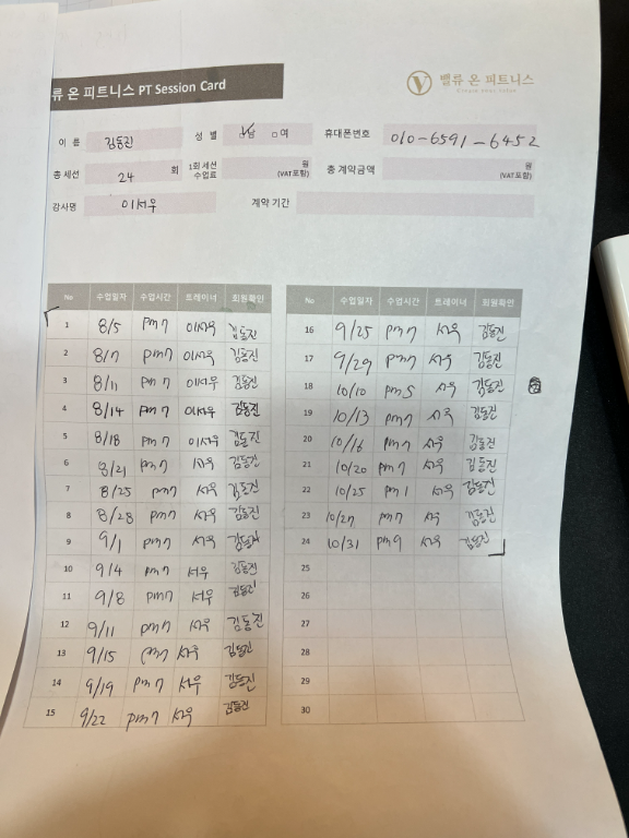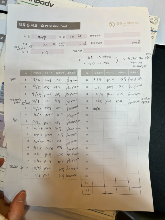 4. 수업일지를 꼼꼼하게 작성&정리하셔서 보내주신다!(수업 중 영상도 꼼꼼히 찍어주셔서 개인운동할 때 도움이 많이 돼요!💗)