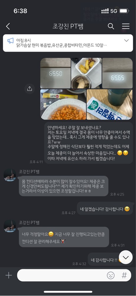 매일 pt 받기 전에 아침에 연락을 주시는데 선생님의 꼼꼼함이 운동하는데 너무 도움이 됩니당!