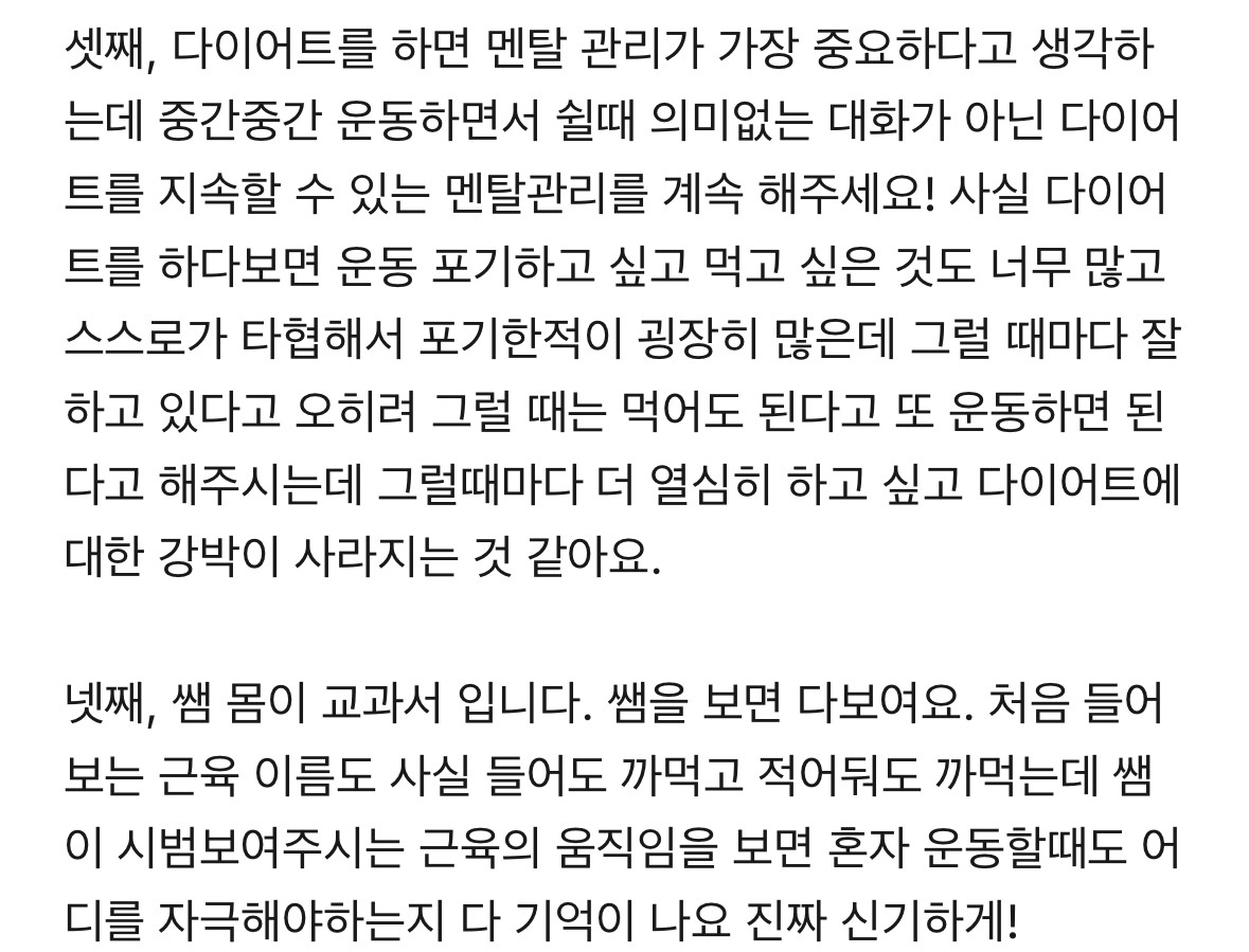 쌤이 제 니즈에 맞게 너무 타이트하지도, 그렇다고 너무 풀어지지도 않게 옆에서 식단이랑 운동 잘 챙겨주셔서 건강하게 다이어트 하고 있숩니당><