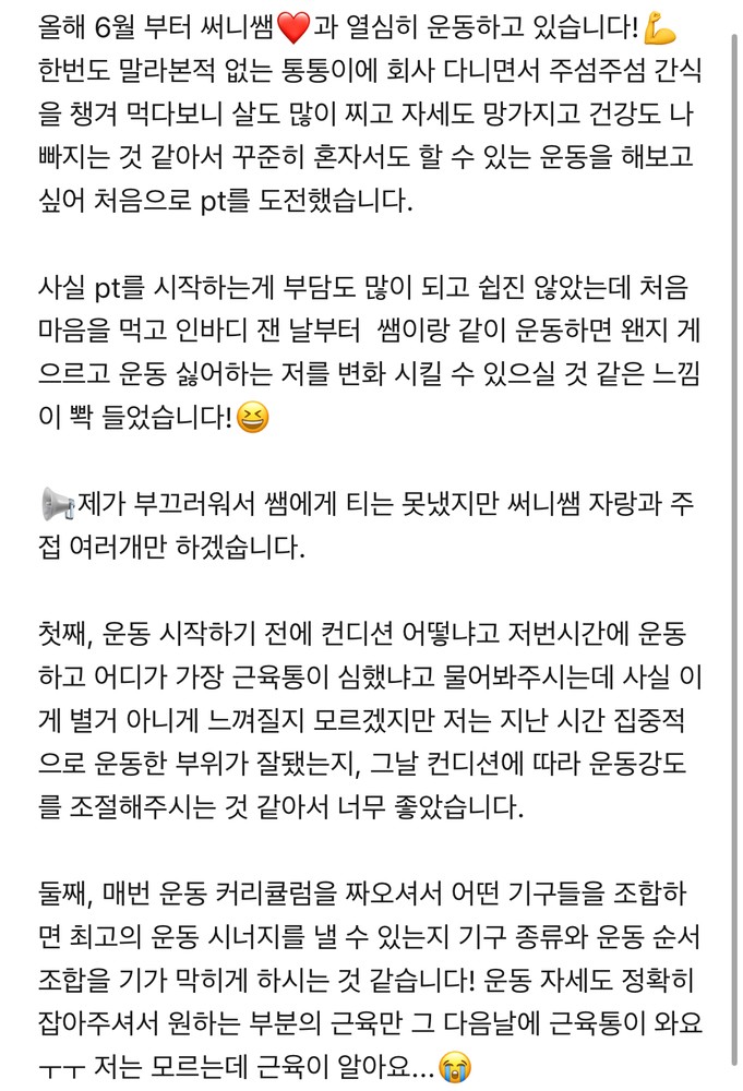 “일단 해 그냥 해”가 아닌, 진짜 내 몸에 맞는 운동을 할 수 있게 되어서 너무 좋아요!!제 빛과 소금 써니쌤☀️ 공유하기 아쉽지만 감사한 마음에 추천남깁니당. 장점이 워낙 많으시지만..