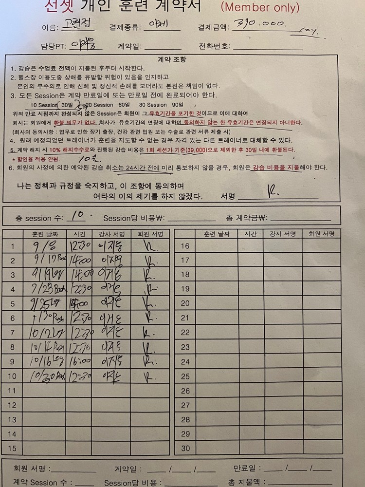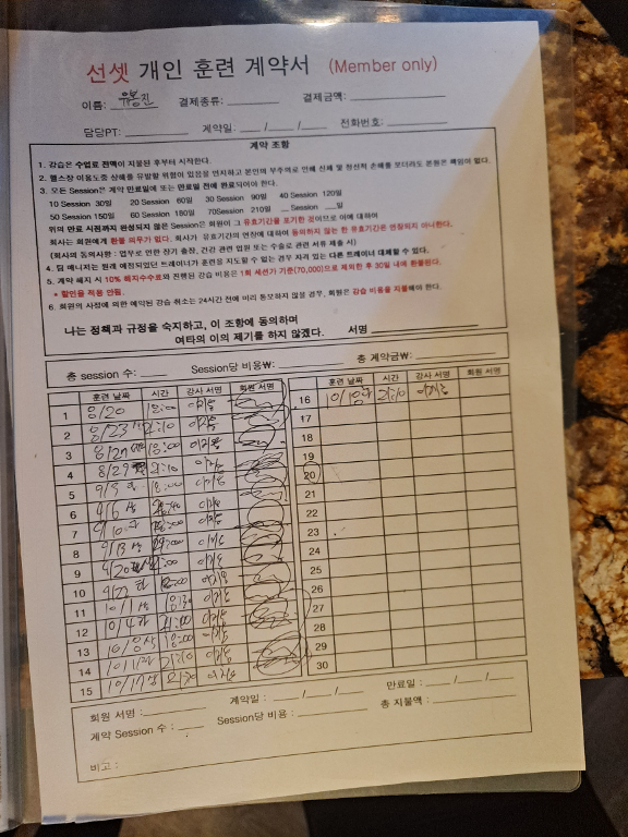 개인적으로 헬스류의 운동은 해보지 않았기때문에 pt수업을 받기로 마음먹고 짐오브선셋에 등록했습니다.