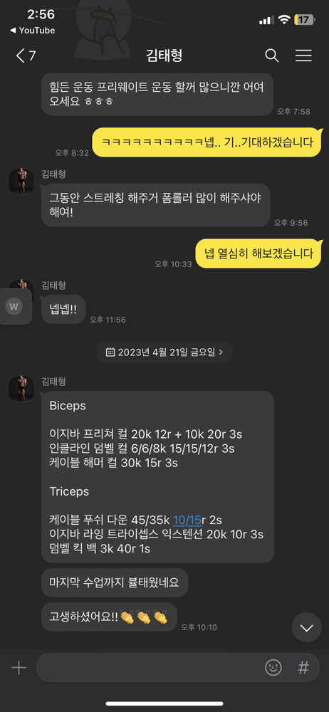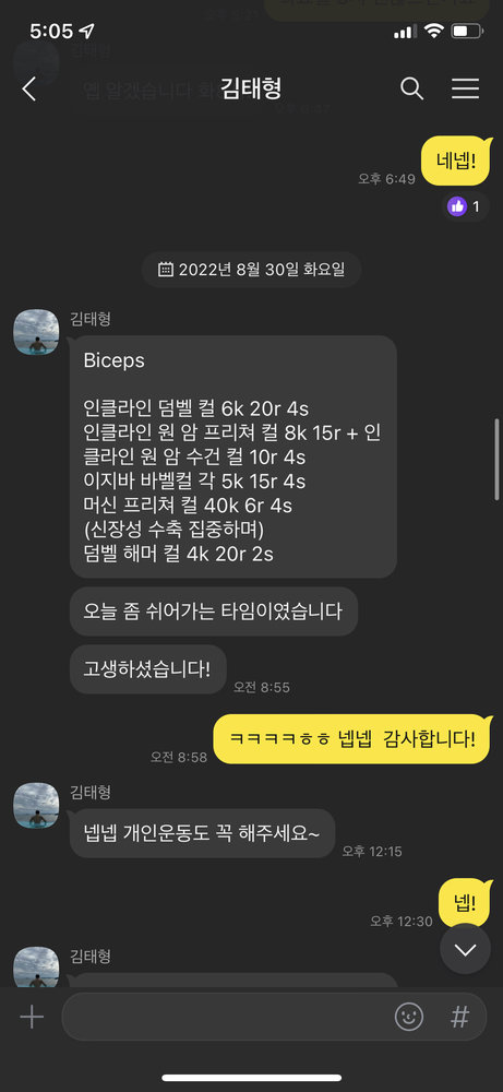 1. 매 수업마다 운동을 한 내역과 운동 피드백을 카톡으로 보내주어 혼자 운동할때 도움됨
