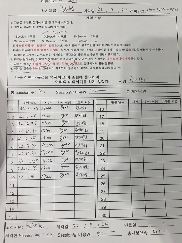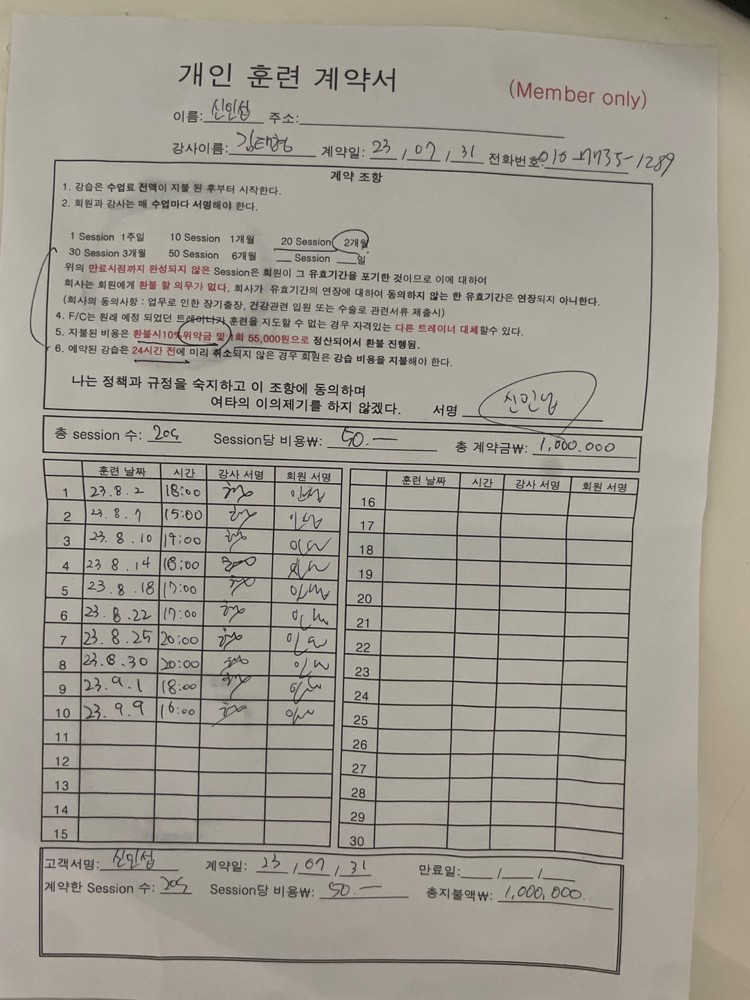 10회가 짧았다면 짧았지만 트레이너님이 너무 친절하시게 자세 하나하나 잡아주시고 운동이 끝나면 늘 정리해서 보내주시는게 개인운동 할때 너무 도움도 되서 좋았습니다 !