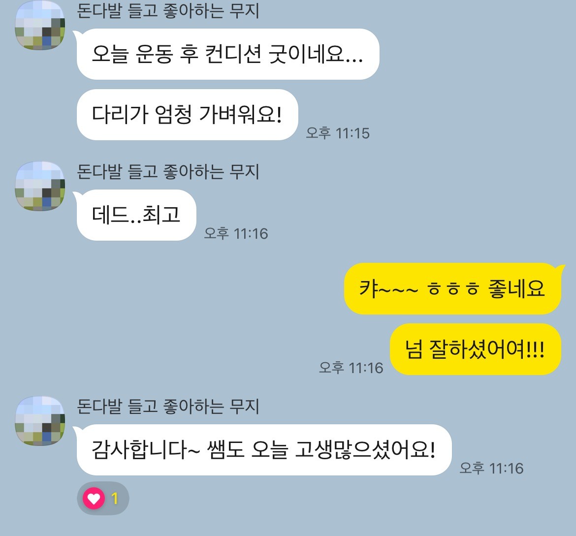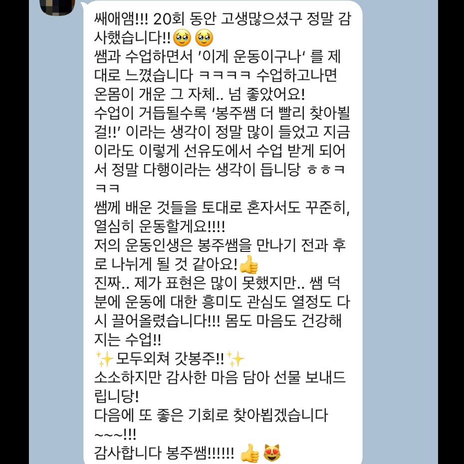 디스크 초기 진단과 허리 통증으로 걱정이 많으셨을 텐데, 상담부터 자세 체크, 컨디션에 맞춘 수업까지 믿고 맡겨주셔서 감사합니다. 허리 통증이 줄고 자세가 좋아졌다는 변화를 느끼신다니 저도 정말 보람돼요💪