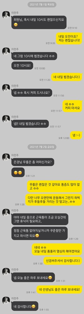 찬주쌤은 일단 운동을 워낙 좋아하시고 재활쪽으로 특화된 고급피티선생님이시기 때문에 회원 몸에 맞춰서 항상 공부하시고 도움이 되는 자세나 자료를 보내주시면서 내 몸처럼 걱정해주시고 함께 호흡하면서 운동을 해주셔요. 강추합니다!