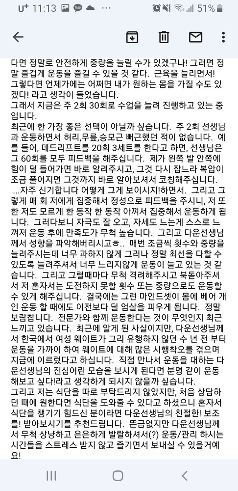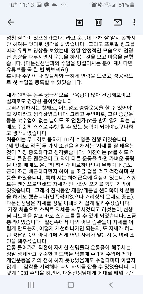 내가 원하는 바디라인이 무엇인지 정확하게 파악하고 거기에 맞게 필요한 운동을 알려주시는데, 특히 다운쌤은 운동 자세를 가장 중요하게 여기셔서 운동마다 근육을 어떻게 제대로 사용해야하는지 하나하나 세심하게 다 잡아주셨어요. 그래서 다운쌤이랑 운동할 때는 훨씬 효과적으로 운동이 되고 있다는 게 잘 느껴져서 너무 만족스럽습니다!!