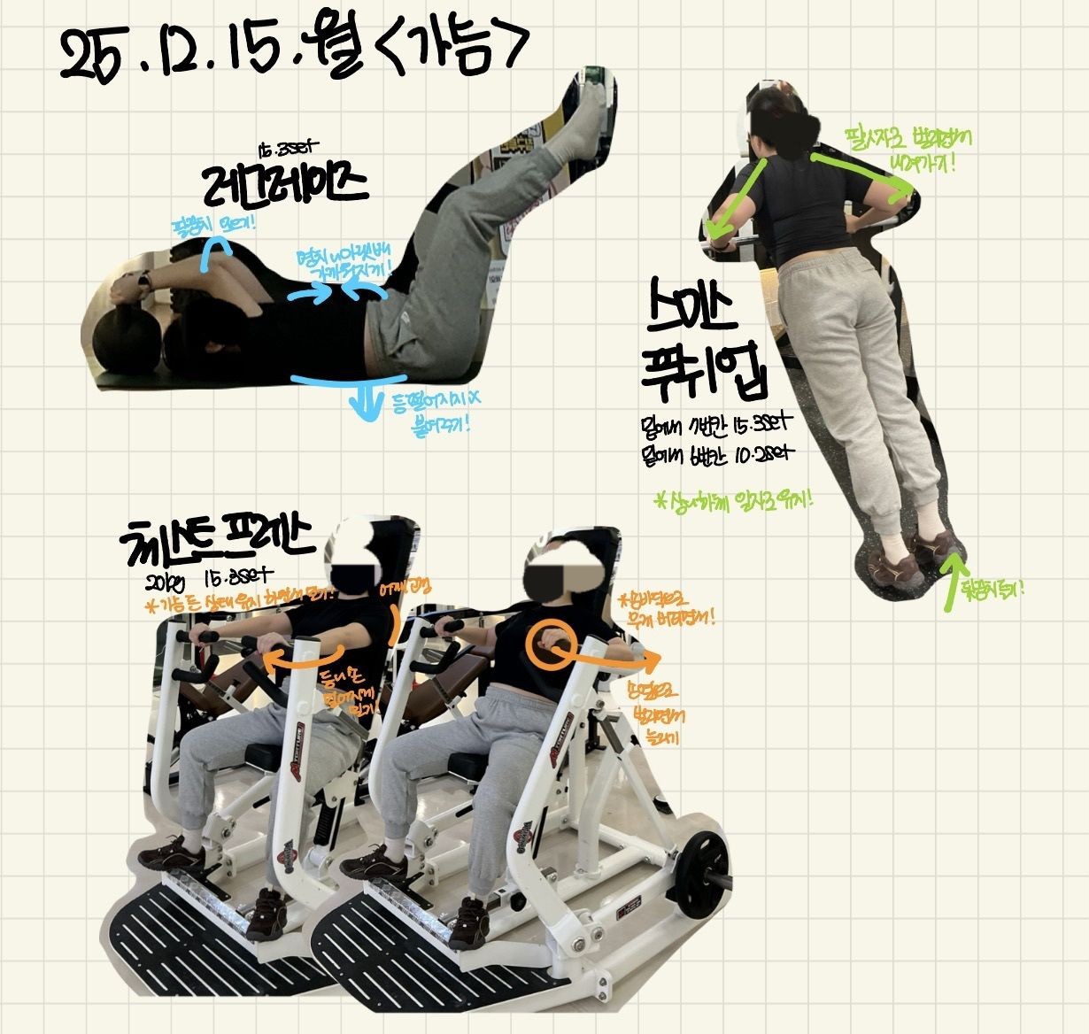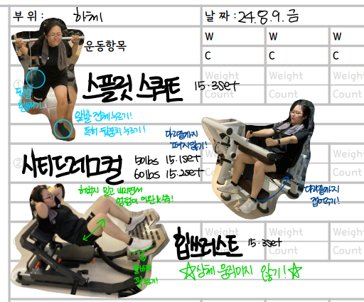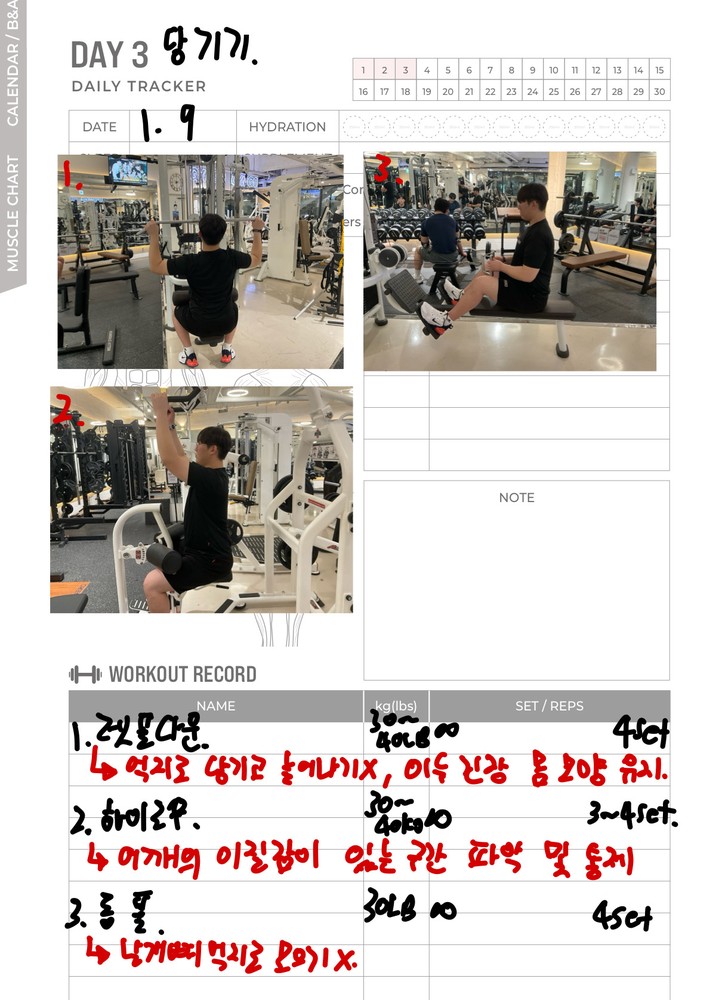 먼저, 기구 사용법에 대해 자세, 위치, 각도에 대해 꼼꼼하게 체크해주십니다. 무엇보다도 운동하는 사진을 짜깁기해서 매일 레슨 후 올려주시는데, 혼자 헬스할 때 큰 도움됩니다!👍