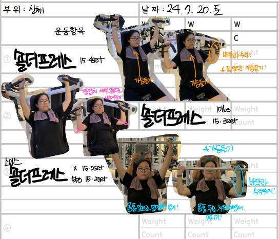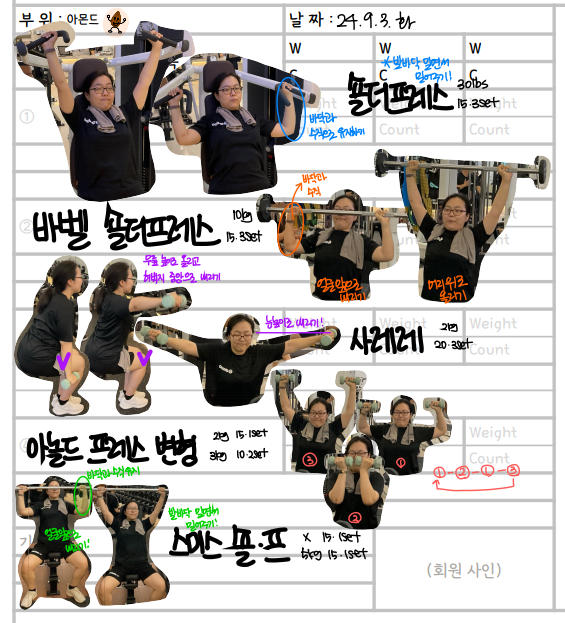 영진쌤과 오티 3회 진행하면서 운동기구 사용법이랑 제 몸에 맞는 운동방법에 대해 배웠어요.