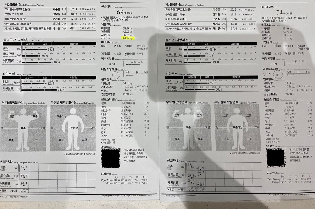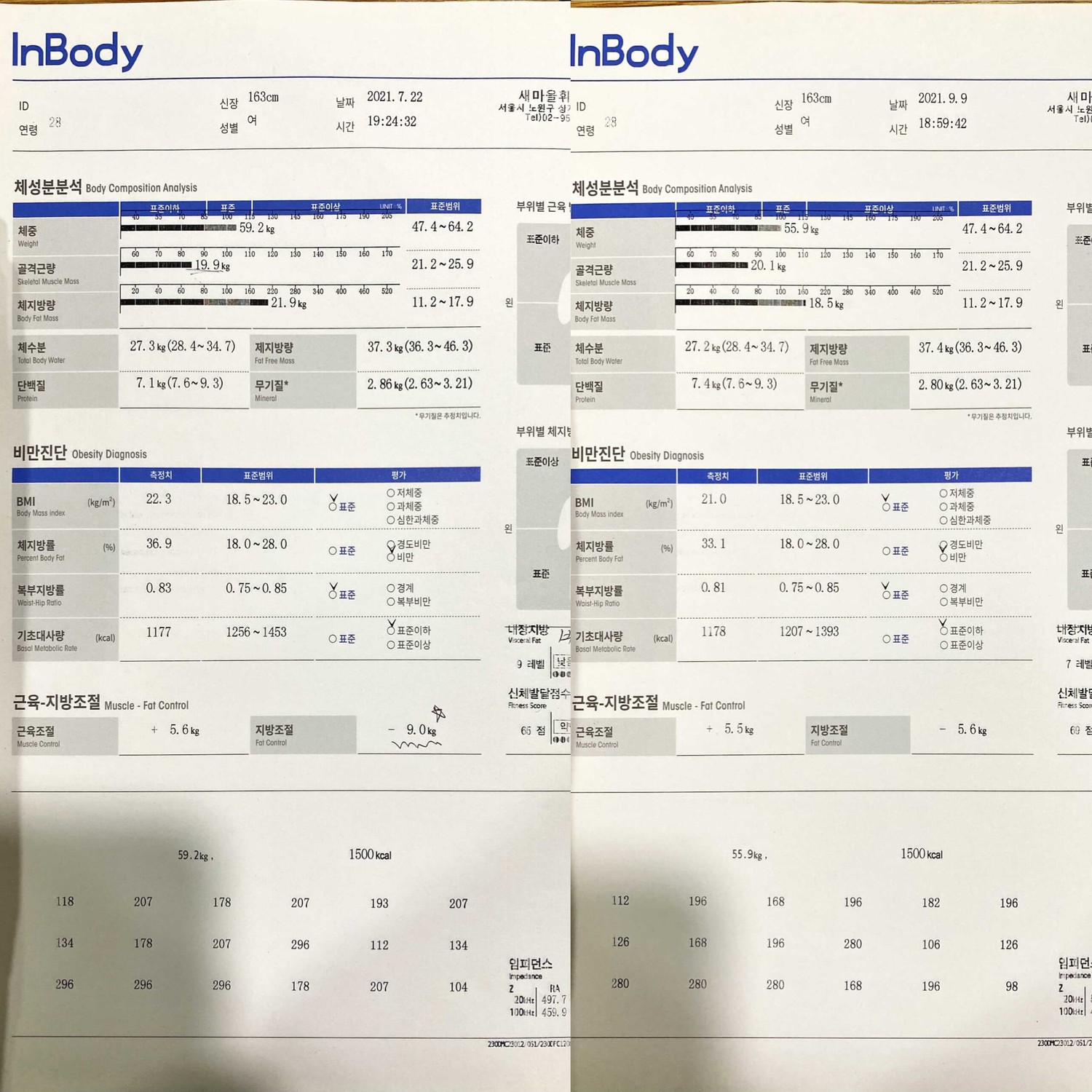 지금 쌤한테 수업받은지 1달반/횟수로 11번 받았는데 체지방 3.5kg감량에 근육도 조금 붙었어요!!