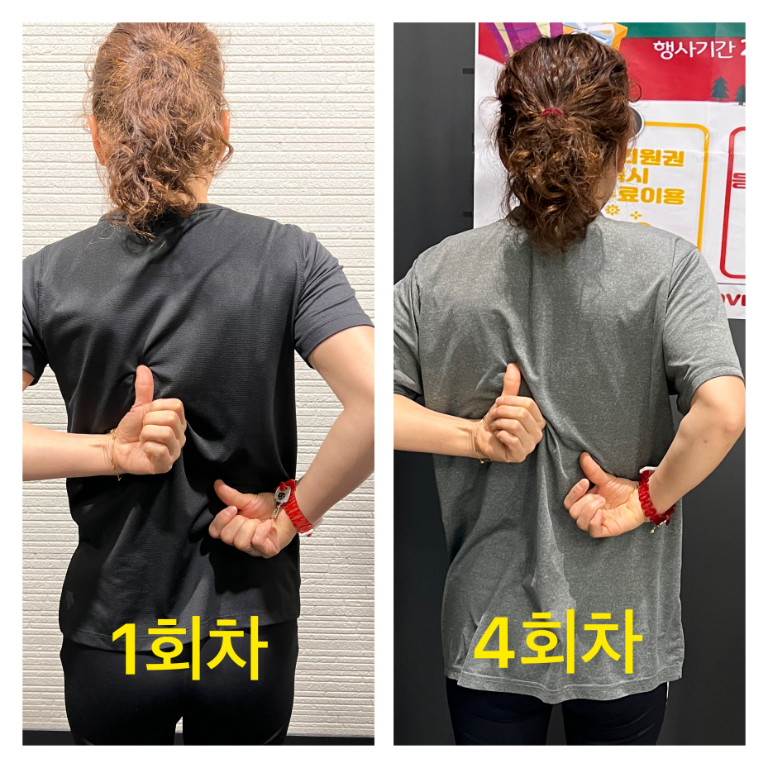 처음에는 몸이 옆으로 많이 기울어져있었는데 선생님이 마사지를 해주시고 운동까지 곁들여서 하니 바른 자세를 가질 수 있었습니다 저의 바른 자세를 보고 주번 동료들이 비결이 뭐냐고 물을 정도입니다