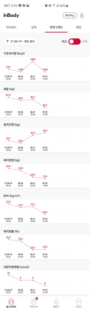 어느덧 8번이라는 PT를 받고 처음보다 체지방 -1, 근육량 +1이라는 놀라운 결과도 얻었습니다.
