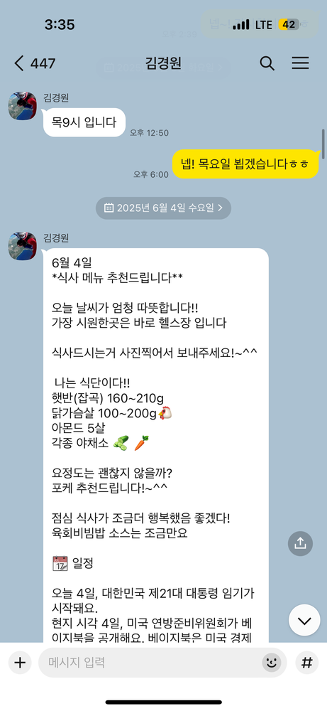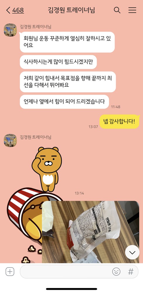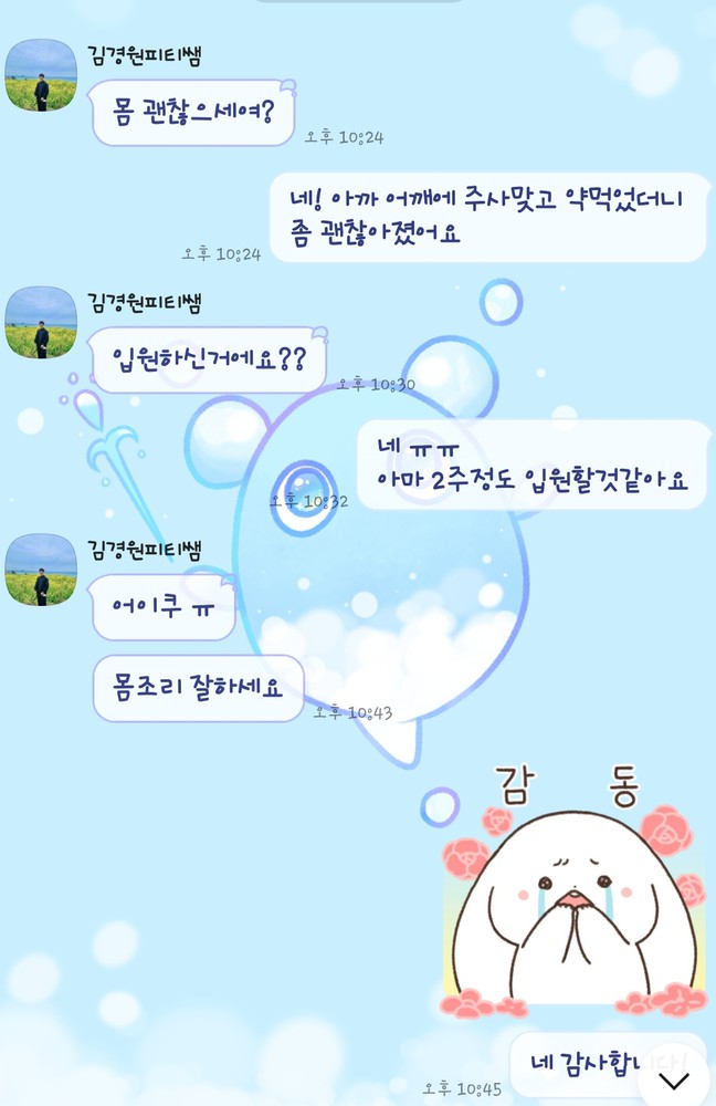 중간중간 사고가나서 입원하기도하고 코로나때문에 운동을 못가는 일이 있었는데 제 건강을 먼저 염려해주시고 중간중간 제 상태를 확인해주셨어요