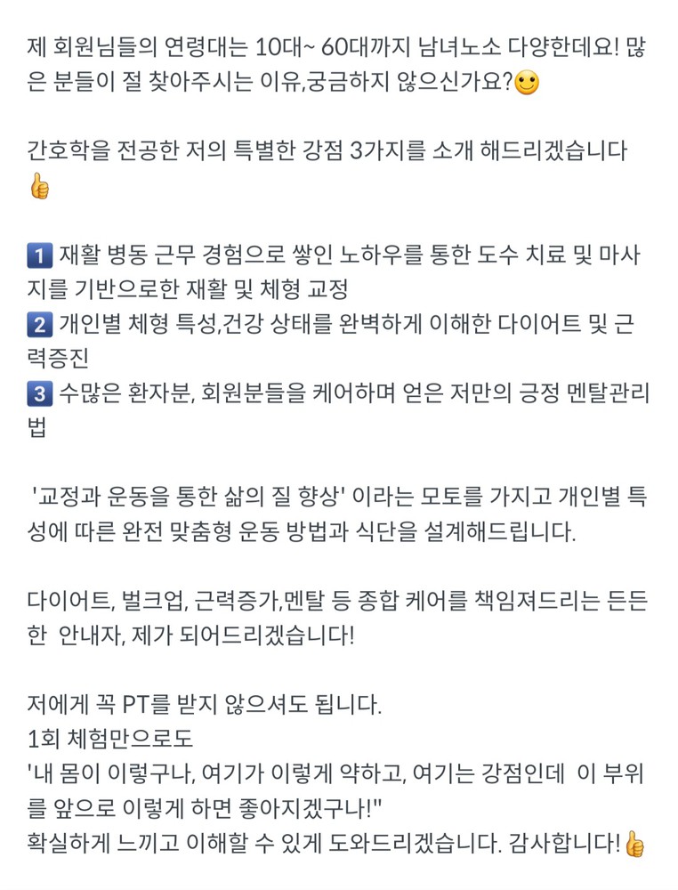 확실히 다른쌤들과는 차별화 되어있고 몸을 잘봐주시는 거같아 정말정말 만족중입니다!!!!!!