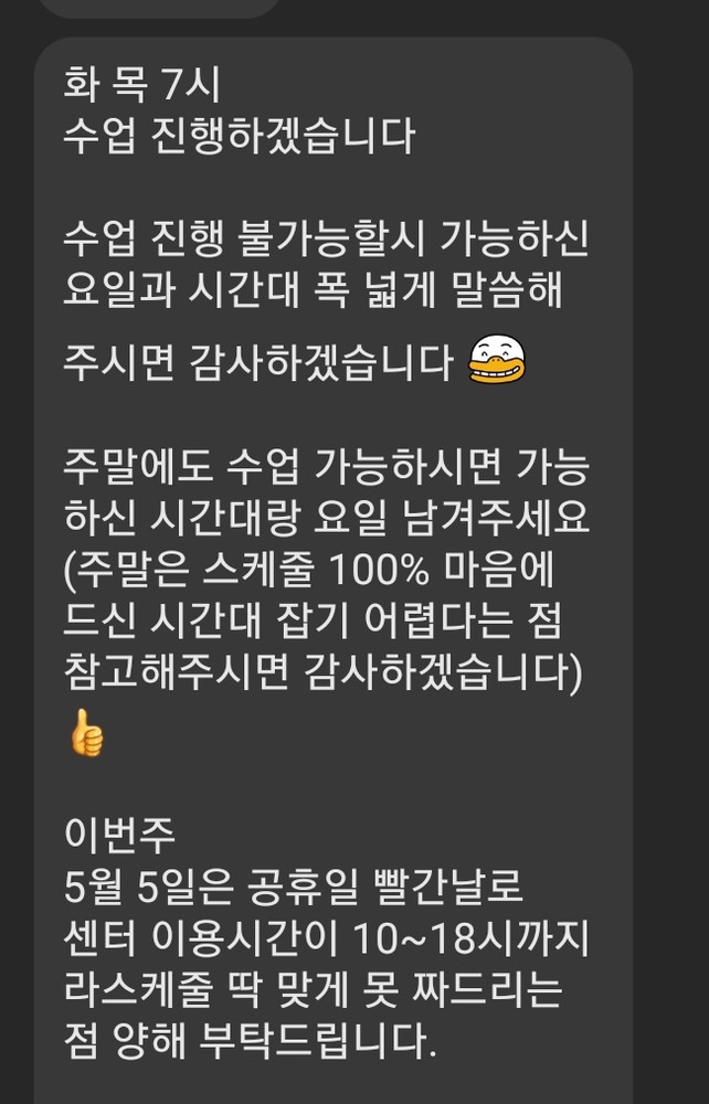 그리고 개인적으로 또 좋았던 점은 갑자기 야근을 하게 된다거나 개인사정이 생길때 수업일정을 제 스케줄에 최대한 맞춰주시는 거 였어요 🥹