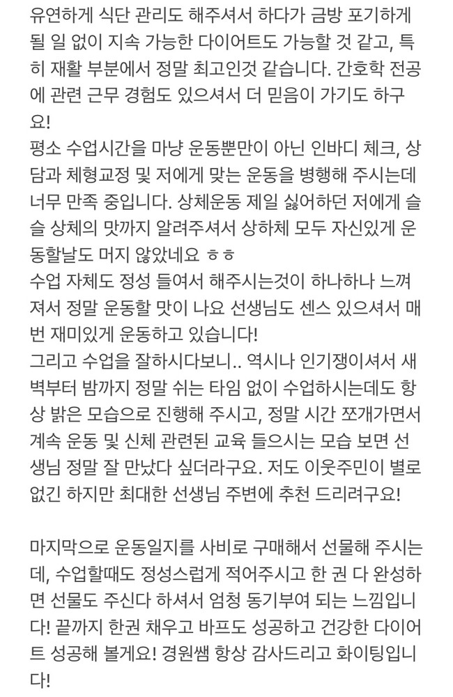 그외에서 수업전 상담 꼼꼼히해서 운동방향 잘 잡아주시고 수업내용정리, 피드백도 보내주시고 다음날 컨디션체크까지 체계적인 수업 방식이 매우 만족스럽습니다 꼼꼼하고 열정넘치는 <경원쌤 수업 추천드려요👍🏻>
