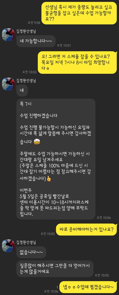 제 몸상태나 여러가지 상황을 잘 이해해주시고 수업시간이나 날짜도 잘 잡아주셨어요
