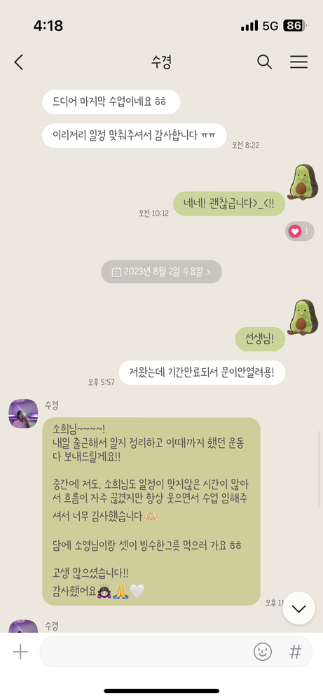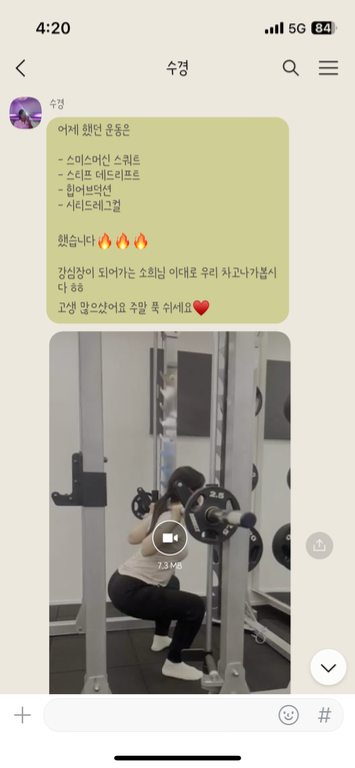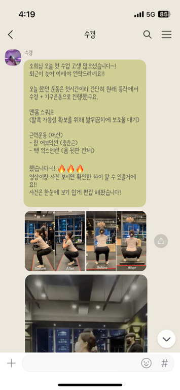 쌤은 항상 파이팅 넘치시고,, 딱딱할줄 알았던 PT단톡방은 수경쌤의 개인 운동모습이나 잘자라는 영상들로 늘 활기찼어요 ^,,^ 굳 !