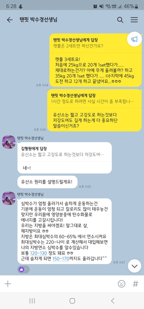 수업하면서 응원해 주시고 쉬는 동안 틈틈이 재밌는 대화로 긴장을 풀어주셔서 편하게 운동에 집중할 수 있었습니다