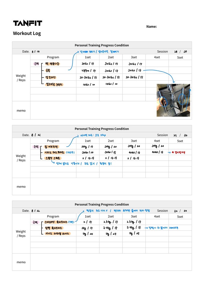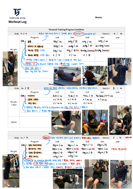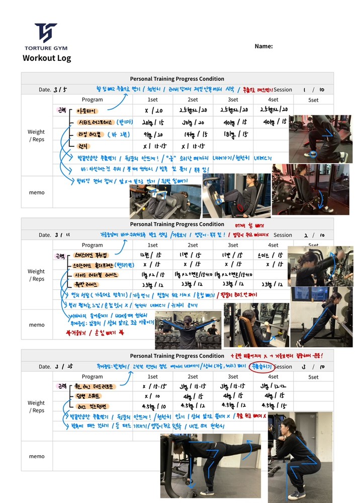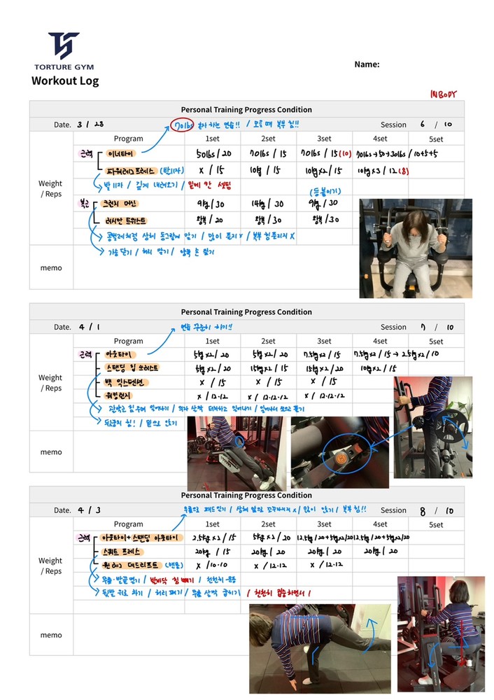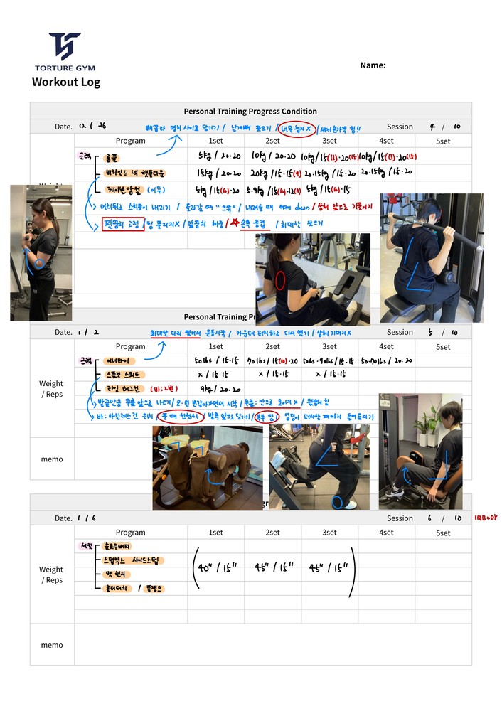 매 시간마다 사진도 첨부해서 꼼꼼하게 일지를 작성해주신 덕분에 개인 운동할 때 쉽게 복습할 수 있었어요. 앞으로도 일지 보면서 열심히 운동하겠습니다!!
