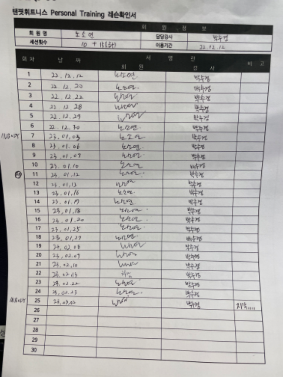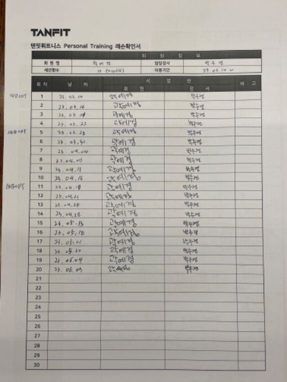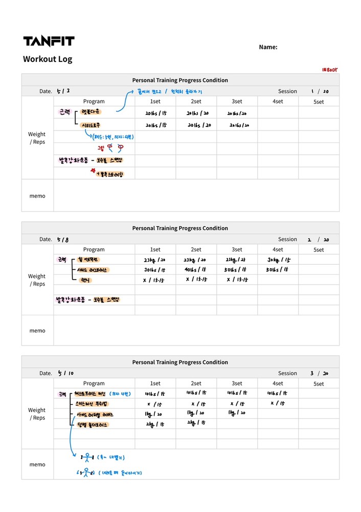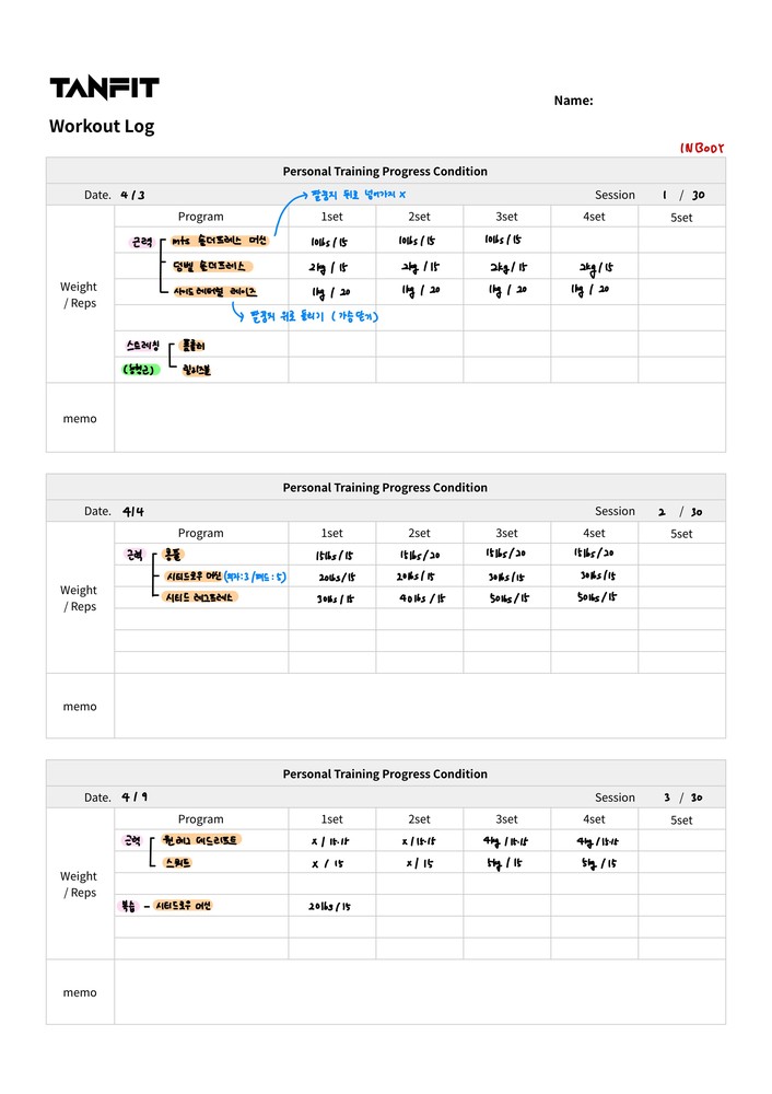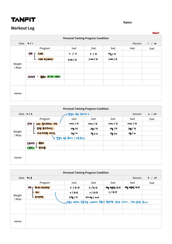매 시간마다 사진도 첨부해서 꼼꼼하게 일지를 작성해주신 덕분에 개인 운동할 때 쉽게 복습할 수 있었어요. 앞으로도 일지 보면서 열심히 운동하겠습니다!!