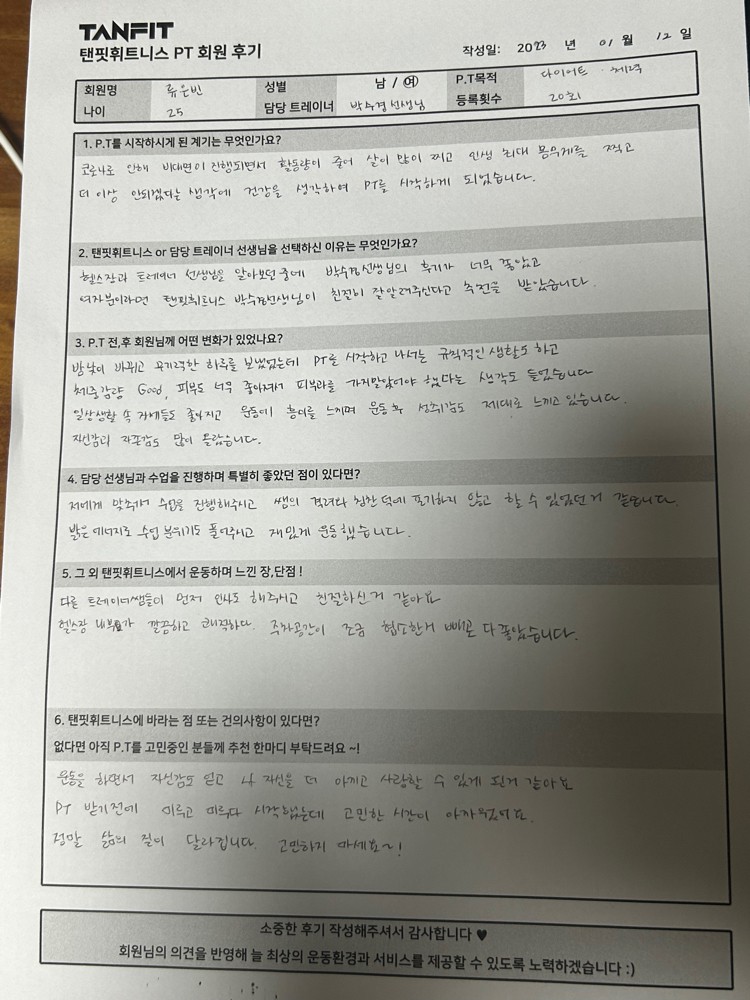 많이 걱정도 하고, 또 긴장도 했지만 선생님이 너무 좋은 분이시라 즐겁게 운동할 수 있었습니다!! 덕분에 운동하는 습관도 잡히고, 식단도 어느정도 익숙해져서.. 앞으로도 꾸준히 실천할 생각입니다!