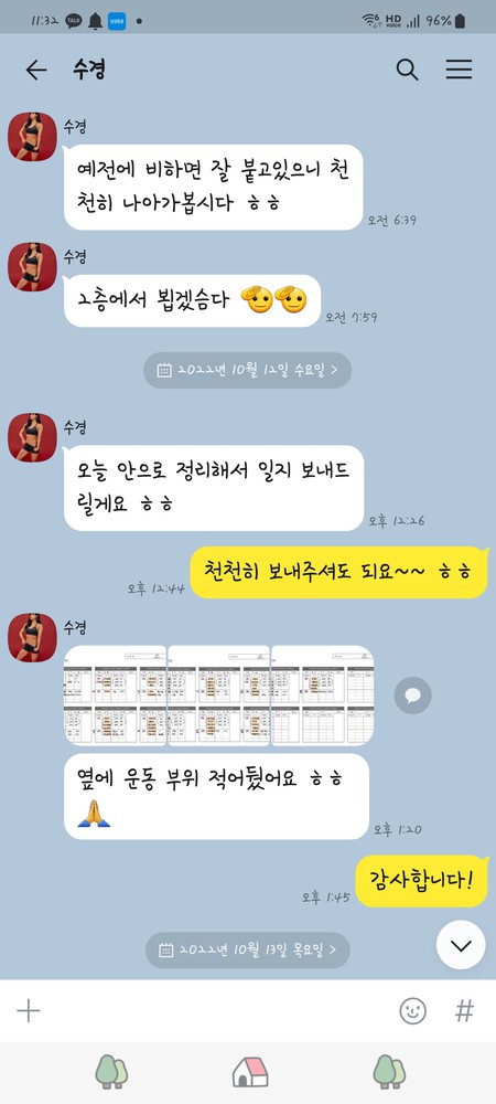 기구 하나하나 사용법 설명 잘해주시고 매일 꼼꼼한 일지+운동하는 영상까지 보내주셔서 개인운동도 혼자서 쉽게 할 수 있었습니당