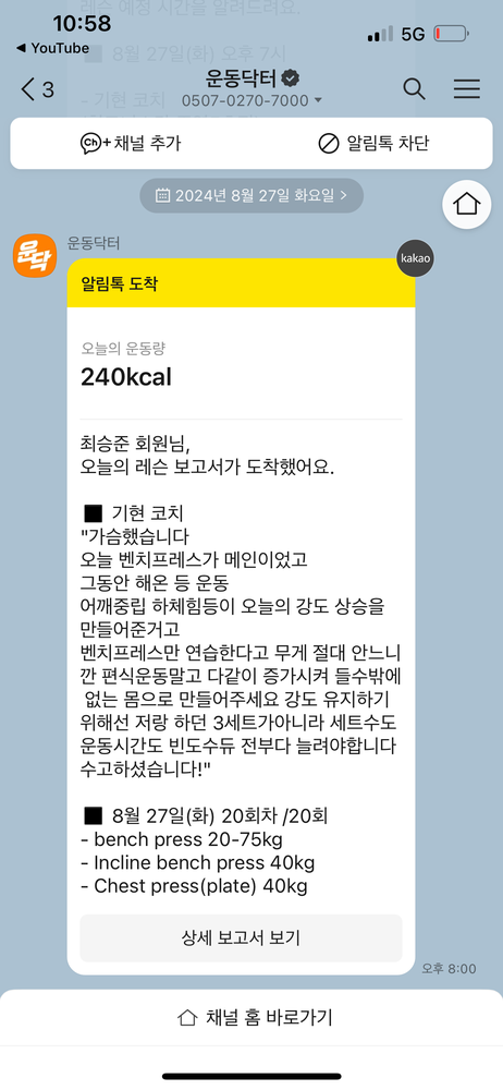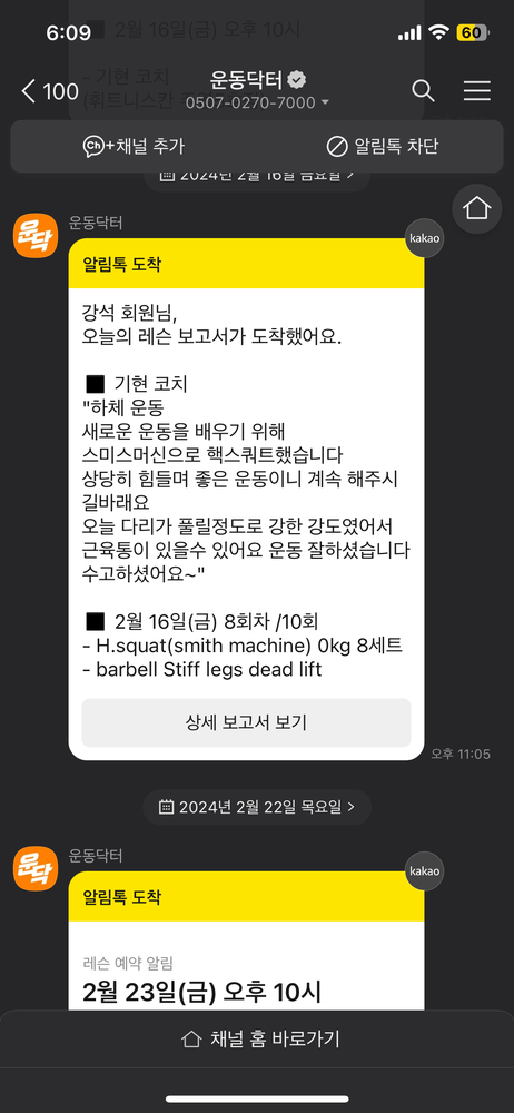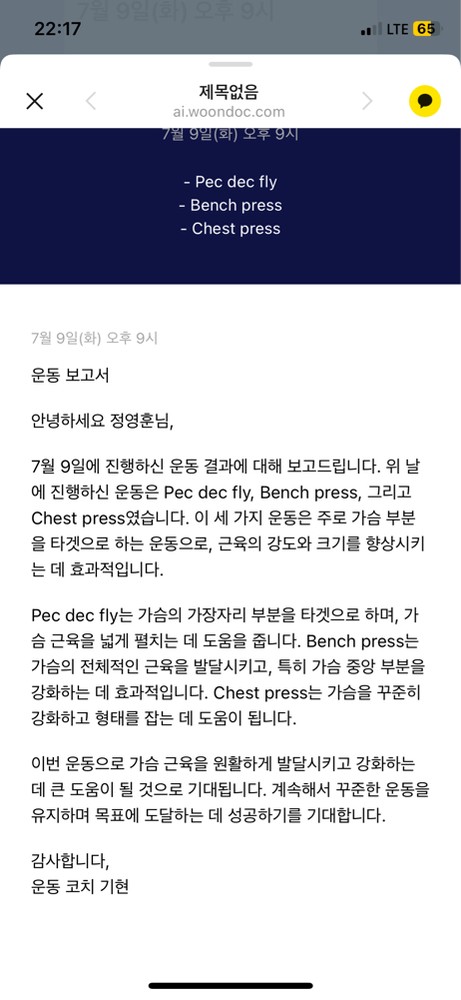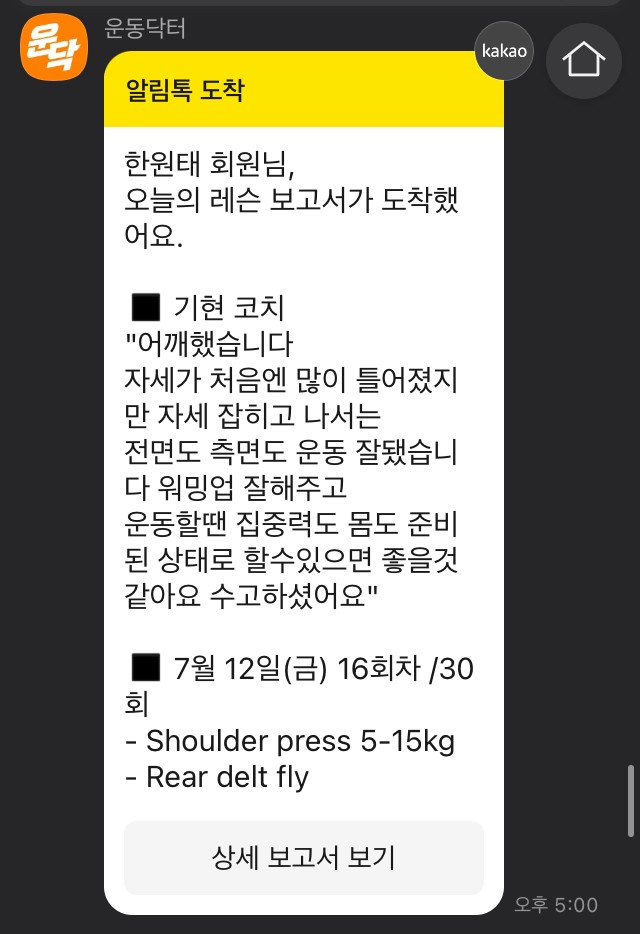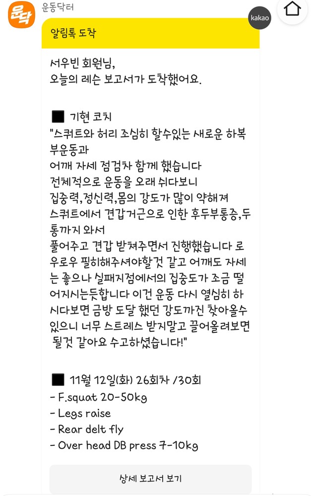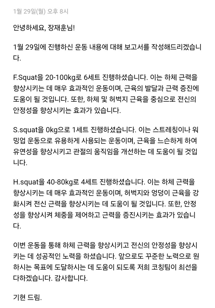 둘째, 매 수업이 끝날 때마다 그날 운동 과정과 피드백을 정리해 주셔서, 다음번 운동 때도 잊지 않고 적용할 수 있었습니다. 덕분에 꾸준히 발전하고 있다는 걸 직접 느끼고 있습니다.