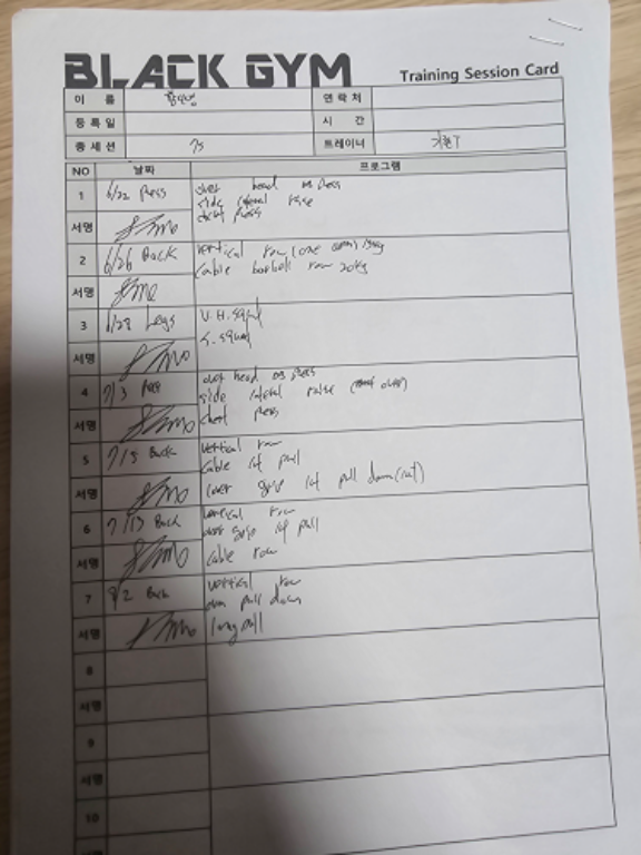 제 자세 잡아주느랴 수업하면 늘 쌤이 더 힘들어보였던 열정쌤입니다.. 운동에 진심인 분ㅎㅎ 기현쌤 수업은 믿고 추천합니다!🫡블랙짐에서 기현쌤한테 30회 피티 수업을 받고, 약 11개월 정도 운동을 계속 하고 있습니다!