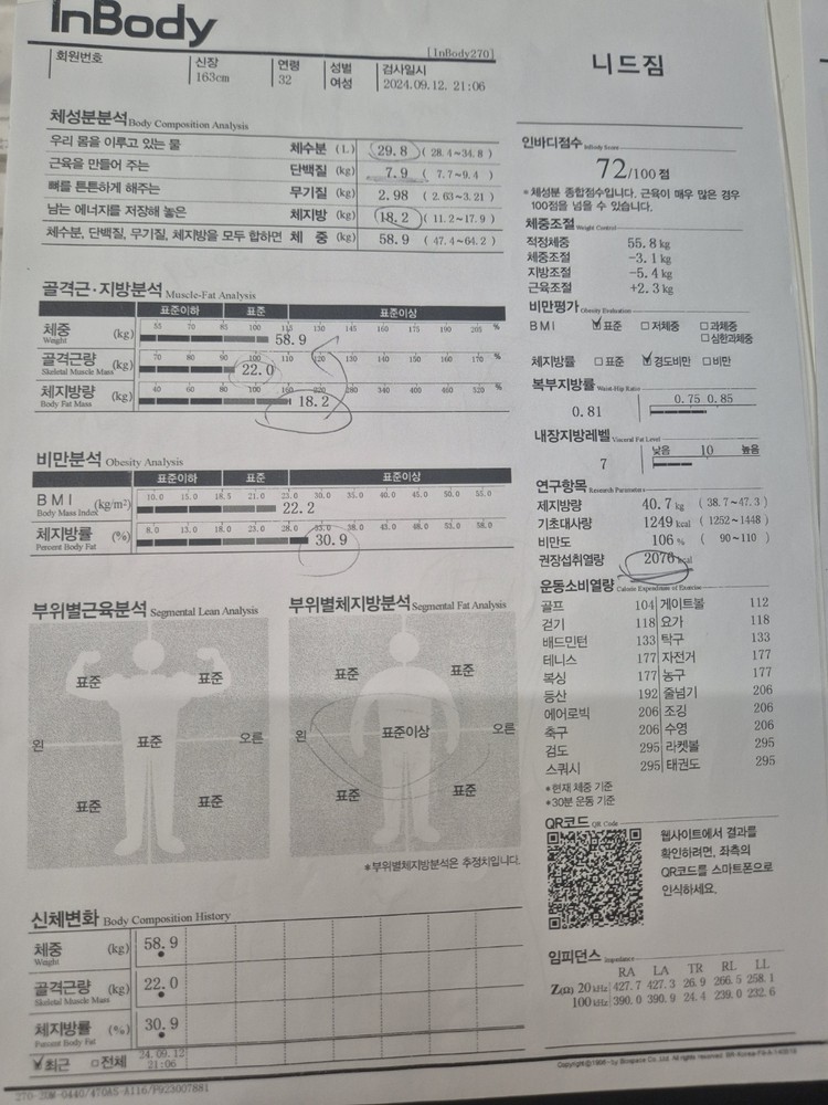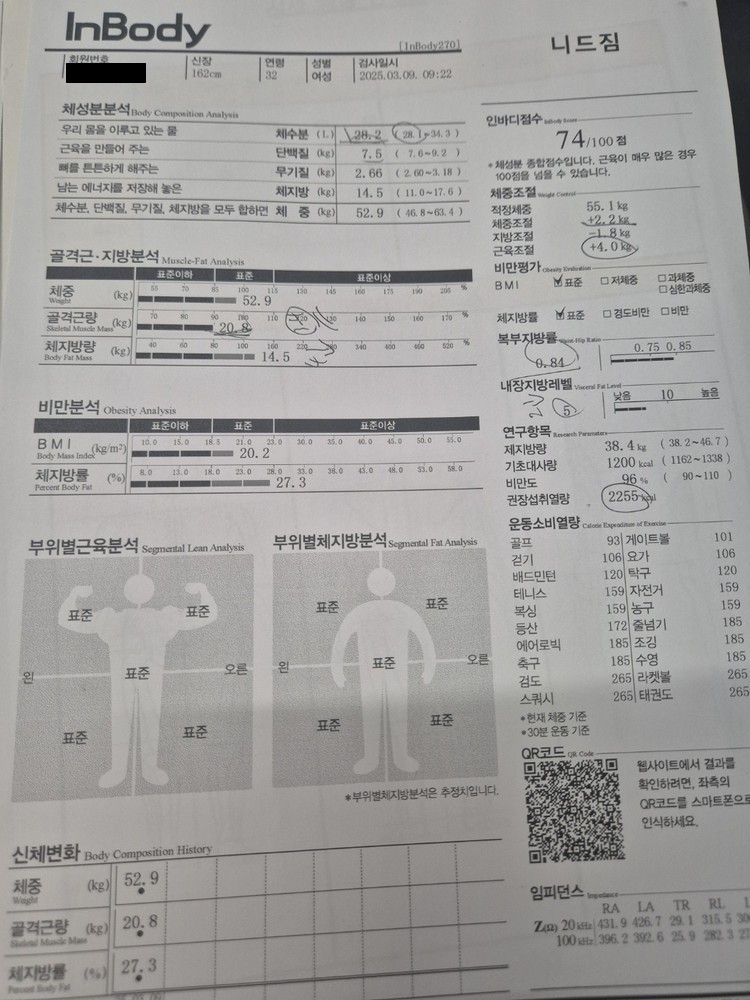 약 8개월 정도 꾸준히 PT 수업 및 식단 관리, 개인 운동 루틴을 만들어 주신 대로 실천했더니 근육량 증가, 체지방량 감소 등 눈에 띄는 변화가 있었습니다.
