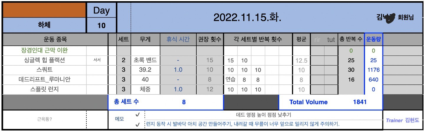 개인운동 때마다 숙제를 내주시는데, 운동종목과 세트 수, 세트당 횟수, 휴식시간, TUT 등이 적혀있어서 그대로 운동하면 탈탈 털린 느낌이 들어서 매일하는 운동이 체계적이라는 생각이 들었습니다. 몸은 키우고 싶은데 그저 막막하신 분은 현도쌤께 수업 받아보세요!