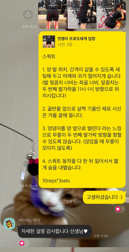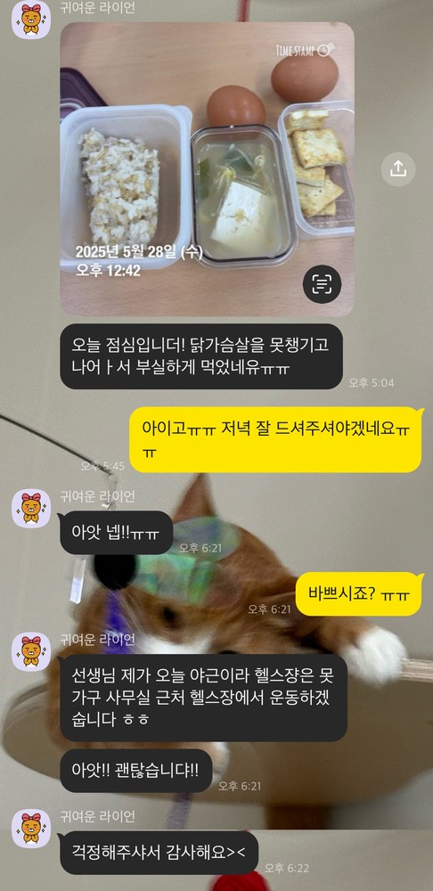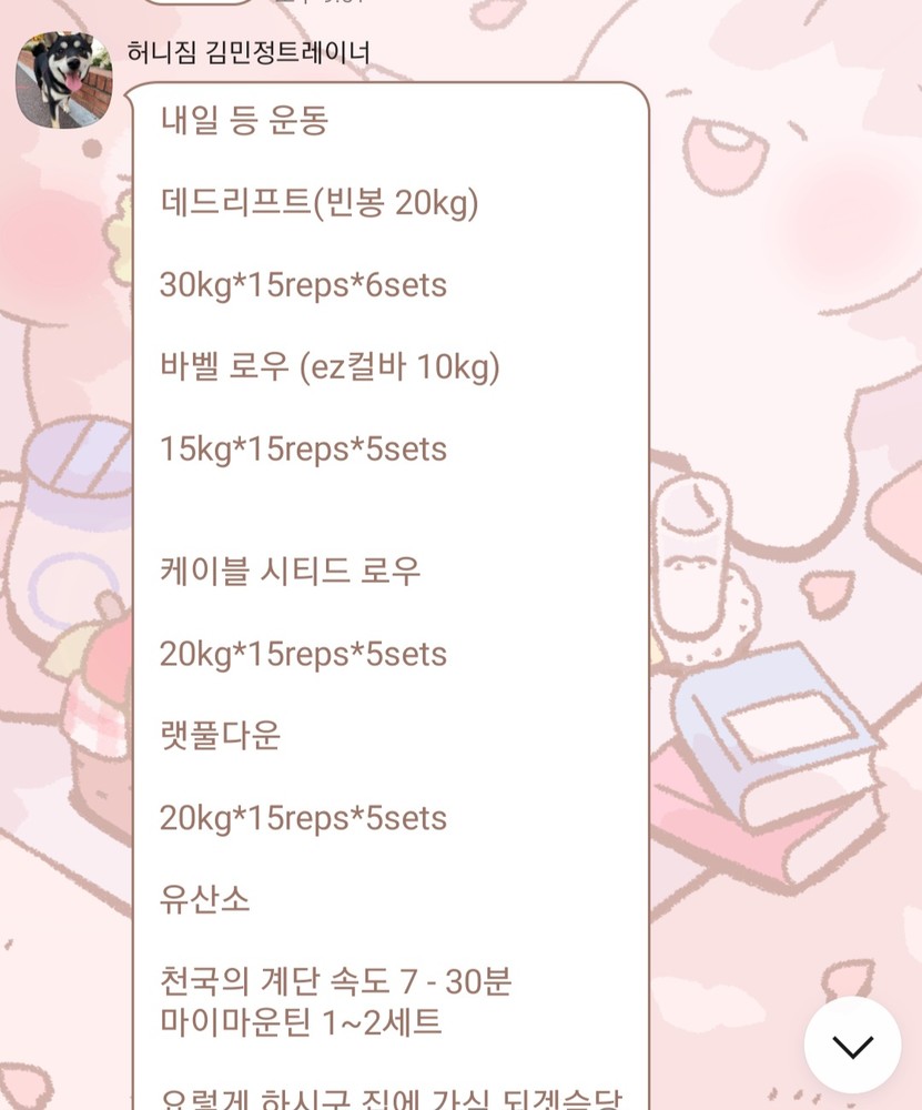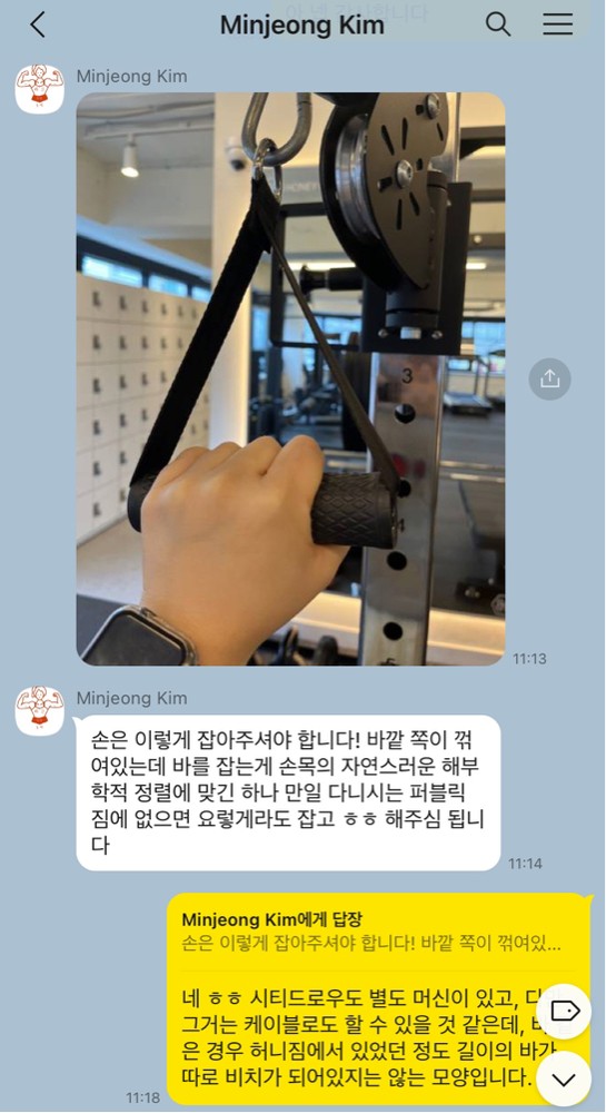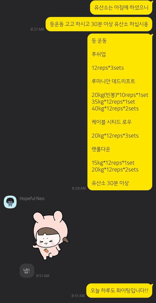 업무로 바쁘신 와중에도 운동을 놓지 않으시는 모습 보며 저도 에너지를 많이 얻어요! 때로는 힘들어서 하찮게 느껴질 때도 있겠지만, 이미 회원님의 몸은 예전보다 훨씬 단단해지고 있답니다. 남은 시간도 윤설님 컨디션에 딱 맞춰서, 가장 효율적이고 즐거운 운동 시간 만들어 드릴게요!