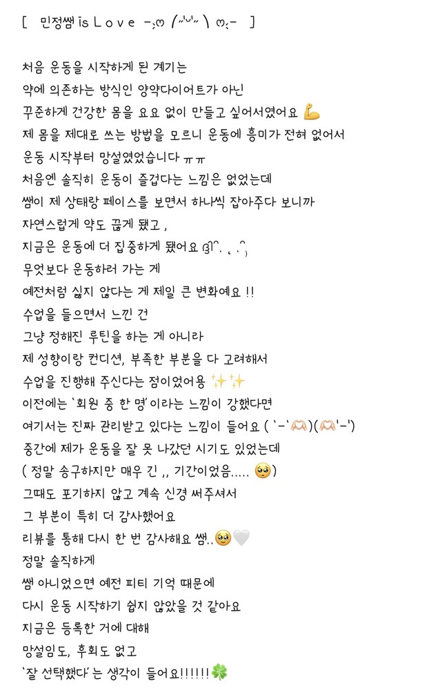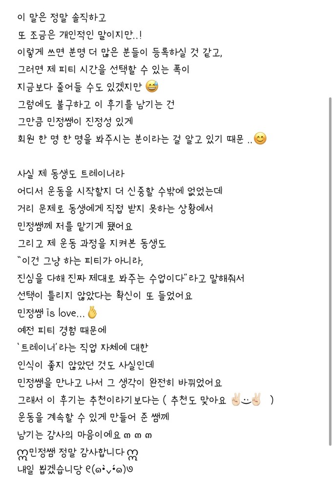 첫 체험 수업 때의 인연이 벌써 7개월이나 이어졌네요. 저의 체형과 운동 스타일을 믿고 선택해 주신 만큼, 회원님께 딱 맞는 '퍼스널'한 지도를 해드리고 싶었는데 그 진심이 뼛속까지 전달된 것 같아 정말 기쁩니다☺️