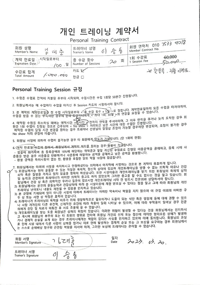 감사합니다🥲약 2달간 피티를 받았습니다. 처음로 한 헬스라 걱정이 많았는데 처음 상담을 하며 어떤식의 운동을 필요로 하는지 그에 맞게 맞추어 운동프로그램을 진행시켜주어 부담없이 지속가능하게 운동할수있게 해주셨습니다. 또한 무리한 운동보단 바른습관을 만들어주기위해 시작 전 교정운동과 웜업운동도 열심히 알려주셨습니다. 덕분에 어깨에 지속적인 통증이 있었는데 많이 나아졌습니다. 너무 만족합니다.개인별 맞춤 케어를 잘해주십니다 평발이 있어서 오래 걸으면 발이나 무릎에 불편함이 있었는데 운동하기 전보다 불편감이 많이 줄었습니다. 또 안 좋은 생활습관으로 생기는 다양한 자세를 교정하는 스트레칭이나 교정운동도 알려주십니다. 수업 전에 선호하는 운동 성향과 목표에 맞게 한두 달이 아니라 지속적으로 할 수 있는 운동 강도로 수업이 이뤄 저서 따라가기 어렵지 않고 즐겁게 운동할 수 있었습니다.