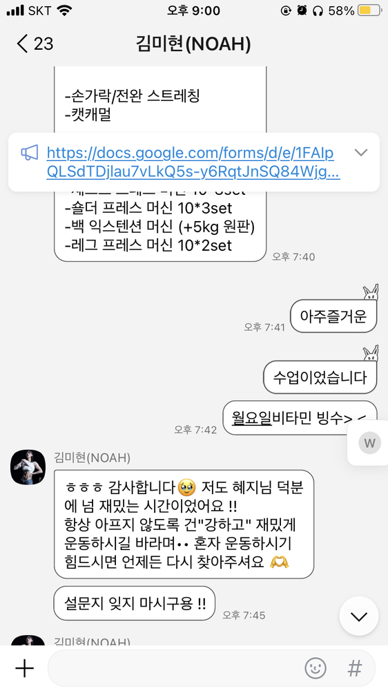 안녕하세요 현나님 ! 마지막 피티 수업이 벌써 엊그제같네요... 작년보다 원알엠 기록도 넘넘 좋아지셨고 체력도 많이 향상되신 모습을 보니 괜히 제가 다 너무 뿌듯합니다 ㅎㅎ 앞으로도 그룹수업, 빙동 때 자주 뵈어요 !! 항상 감사합니다🫶