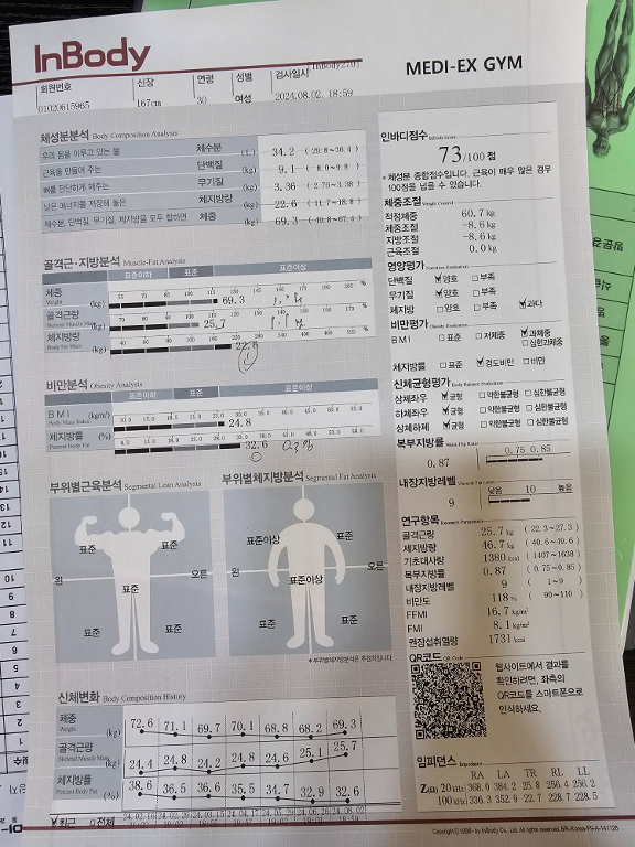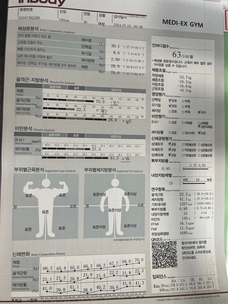 초반에는 다이어트로 일주일 2번만 딱 운동하고 식단 조절했어요. 신기한게 다른 운동할때는 운동한 기분이 안느껴지거나 근육통이 너무 심해서 또 가기가 겁났었는데, 신 트레이너님이랑 운동하고나면 딱 기분좋을 정도로만 근육통이 생겨서 운동하는 재미가 있었습니다. 64-> 57kg 까지 감량하였습니다.