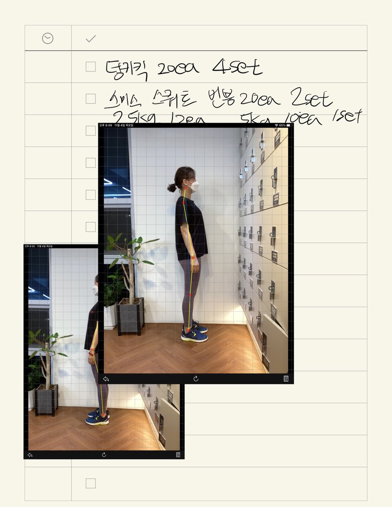 ✔️ 현재 몸 상태를 잘 설명해 주세요🤔 단순히 어디가 안 좋다가 아니라 어디 근육이 약한지 전방경사 후방경사인지 등 전문적인 설명 들으실 수 있습니당💪