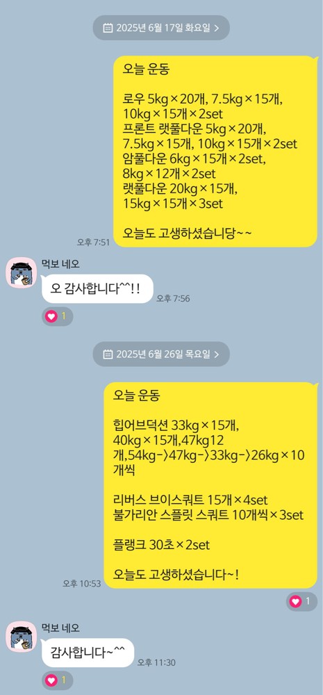 제 친구와 친구의 친구 등 여섯 명이나 윤성쌤에게 PT를 받았네요. 어깨를 넓히고 싶다거나 등을 펴고 싶다거나 허리가 아파서 웨이트를 한다거나… 각자 성별이나 나이, 원하는 것이 달랐지만 다들 만족하고 지인들까지 데리고 온 거 보면 역시 저에게만 좋은 선생님이 아니었나 봅니다.🫶🏻체력증진을 위해 Gym 에 방문했다가 이상엽 코치님을 배정받고, PT10회를 처음 시작했습니다. 하지만 코치님의 전문성과 친절함 때문에 추가 20회를더끊고 총 30회 PT를 받았습니다.