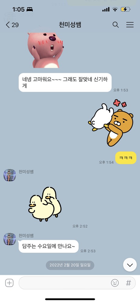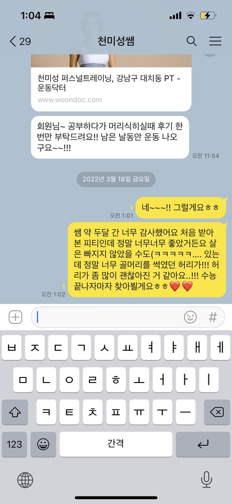 두번째로 성실하고 진정성 있는 스앵님이다 이거에요. 항시 수업을 가득가득 알차게 채워서 진행하시고 가끔은 수업 시간 초과되도록 아주 열정적으로 제 몸을 진두지휘 하십니다. 너무 감사해서 이렇게 리뷰라도 써서 보은하려고 하는 거거등요! 강츄!지인추천으로 알게된 선생님이에요!