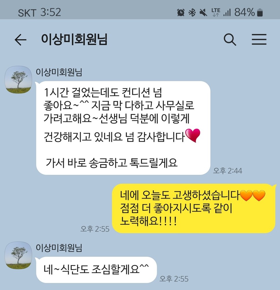소심한 성격이라 이것 저것 걱정이 많은데 친절하게 설명해주셔서 감사합니다 :)4개월전 선생님께 지도받기전엔 스쿼트하나 제대로 못하는 저질체력이었어요. 운동이 중요하단 건 알았지만 피일차일...성격상 논리적으로 이해가 되야 움직이는 편인데 선생님의 해박한 지식덕분에 해당 운동(자세)이 어디에 좋고 왜 해야하는지 근육을 쓸때 어느정도 어떻게 힘이 들어가야하는지 알기 쉽게 이끌어주시니 자세도 잘 나오고 근육량도 늘고 건강해지는 것 같아요~샘 감사합니다^^ 앞으로도 잘 부탁드려요!저는, 항상 p.t를 끊으면 5번을 넘긴 적이 없어요. 원래 운동을 싫어하고, 기초 체력도 없고, 지루하고 힘들기만 하다고 느껴졌거든요..