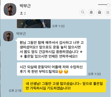 또한 매회 진정성 있는 피드백과 트레이닝에 몸도 조금씩 좋아짐을 느끼고 있습니다 :)