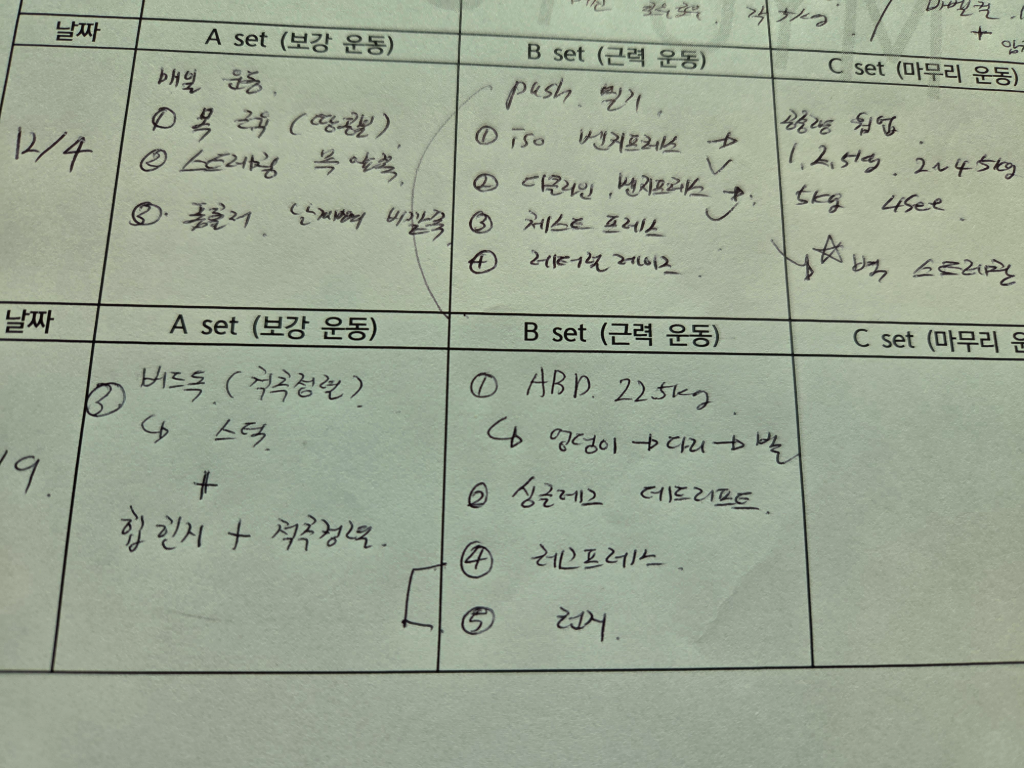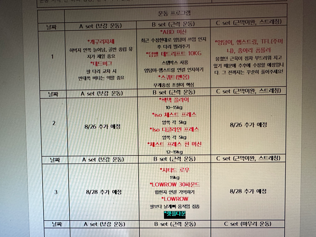 헬스가 처음이라 막막했지만, 사진에서 볼 수 있듯이 세심한 식단 관리 및 데일리 루틴을 짜주시며, 각 루틴에 대한 자세들은 매수업시간마다 원리와 효과를 하나하나 설명해주시며 자세히 가르쳐 주십니다.