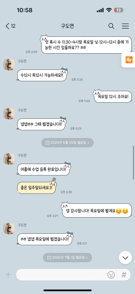 헬스장 기구가 다 낯설고 처음이었는데 도연쌤이 수업 때마다 친절하고 꼼꼼하게 차근차근 가르쳐주셔서 운동과 조금 더 쉽게 친해질 수 있게 된 것 같습니다. 수업시간 외에도 일정을 조율하거나 궁금한 점이 생겼을 때 부담없이 쌤과 소통할 수 있어 운동 초보자인 저는 그 부분이 너무 좋았습니다!