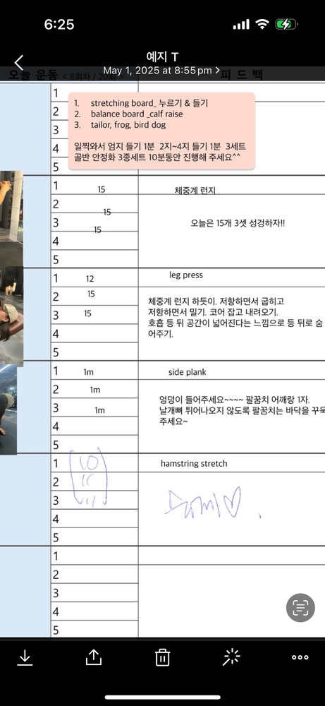 그리고 PT 하는 날 아침마다 미리 일지 공유해주셔서 오늘 뭐하는지 알게되고, 스케줄도 까먹지 않게되서 존좋👍👍👍