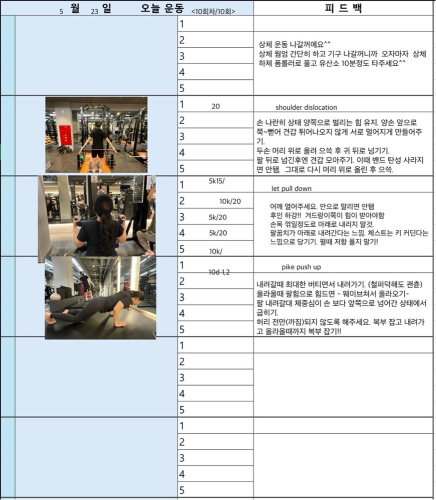 보통 수업 있는 날 아침에 어떤 운동할지 미리 보내주시고 피 티 후 그날 바로 피드백 일지를 보내주십니다. 피드백 보면서 개인운동도 할 수 있어서 혼자 운동하는 것도 어렵지 않아 좋습니다~ 안전하게 몸의 균형 잡아가며 운동하길 원하신다면 예지쌤 강추입니다!!