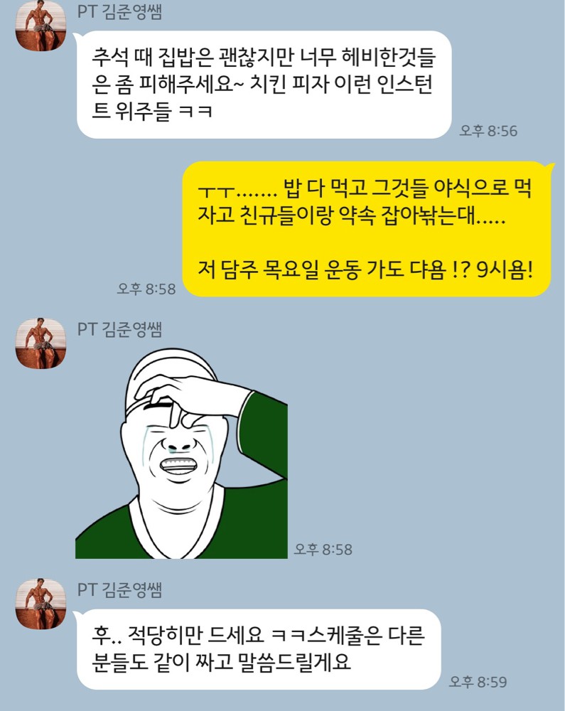 상훈님! 스케줄이 불규칙한데도 어떻게든 시간 내셔서 운동 오시는 모습이 너무 멋집니다😎 앞으로도 꾸준히 저랑 운동 하시면서 목표한 건강한 몸매 가꿔보시죠💪💪💪
