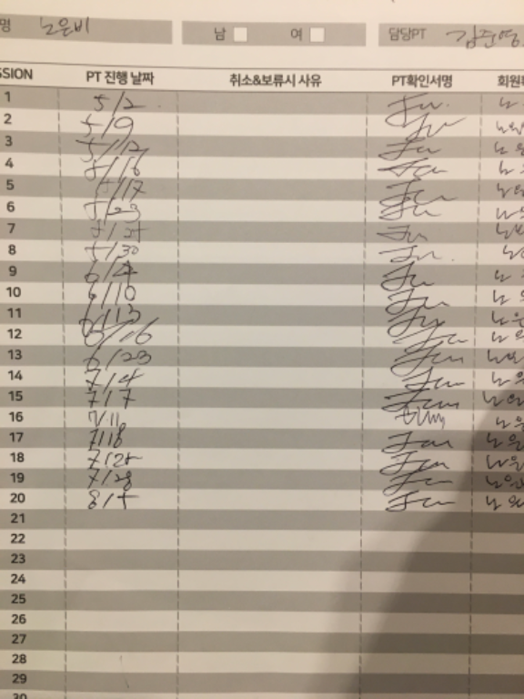 다이어트만을 생각하고 시작한 PT지만 빈약한 상체와 체력을 보강하며 수업에 들어갔고 컨디션 고려하며 무리하게는 시키지 않으셨습니다. 그 덕에 숙련자분들에 비하면 아직 어린이 수준이지만 나름 근력이 붙는다던지 ,말린 어깨가 펴진다던지 하는 외적인 변화부터 쉬는날엔 바닥에 항상 늘어져있던 저였는데 아침 운동을 하는 의식의 변화까지 겪은 20회였습니다.😄 이제는 단순히 체중만 생각하는게 아니라 웨이트를 배우는게 재미있게 느껴져요. 이제 조금 알듯 한 시점에서 끝나는 게 아쉬워 망설임없이 20회 연장을 더 했습니다! 이어서 마지막까지 다시 잘 부탁드리겠습니다!◟̊◞̊ 시작하기 망설여지는 분들이라면 선생님께 수업을 받아보심을 추천해요🙌🏻