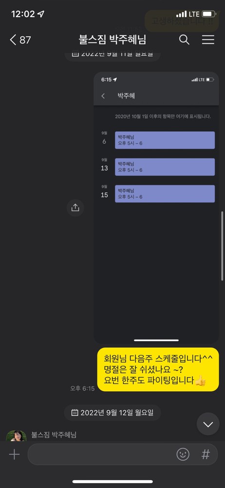 근데 스케쥴 잡는거부터해서 스트레칭, 운동 자세 등 실제 PT 회원들처럼 잘 가르쳐 주셔서 짧은 시간이라도 알차게 배우고 있어서 만족합니다!! 구웃~:)허리와 어깨가 평생 숙제일 만큼 자주 아프고 좋지 않았는데 알려주신 운동을 통해 자세 교정이 되고있어요. 아직 6회차 밖에 되지 않았는데, 허리 아픔은 확실히 없어졌구요.
