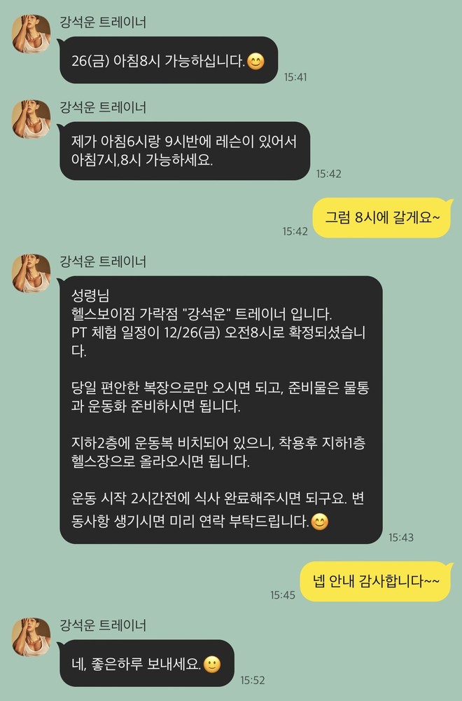 저는 pt를 오래전에 한번 받아본 적 있습니다. 실망을 크게 한지라 이번에 pt를 알아볼 땐 꼼꼼히 알아보고 총 3분께 상담을 받아봤는데 석운 코치님이 가장 열심성의껏 상담해주셨습니다. 다른 분들은 약간 영업한다는 느낌이 들었는데, 석운 코치님은 저한테 도움될만한 상담을 해주셔서 마음에 들었어요! 또한 마인드도 대충하시는 분이 아니라는게 느껴져서 40회를 등록했습니다.