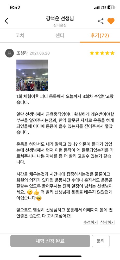 오랜기간 단체수업을 통해 pt를. 해오다가 우연한 기회에 개인pt를 받게되었는데 알지못하고 느낄수없었던 운동방법과 중각중간 근육을 풀어주면서 긴장감을 줄일수있게 해주는 수업이 막연히 개인수업은 힘들다라고 생각했던 개인적인 생각을 싹 지울수있는 계기가 되었고 단체수업이나 다른 선생님들 수업에서는 들을수없었던 디테일과 꼼꼼한 체크에 깊은 감사를 드리고 앞으로도 꾸준히 수업을 받아야겠다는 생각을 가제하는 수업이였습니다 감사합니다