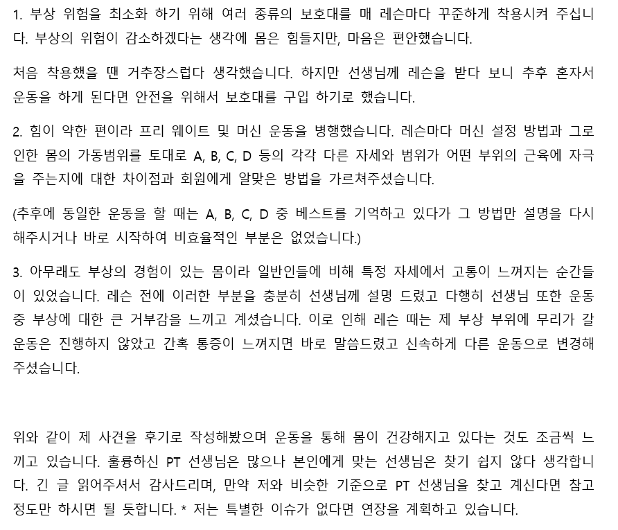 pt는 한번도 받아본적이 없고 헬스 경험도 없는 헬스초보인데 기구사용법이나 프리웨이트 가르쳐 주실때 자세하게 설명해주셔서 처음 운동하시는 분들에 강하게 추천드리고 싶습니다. 소개에 나오신것처럼 운동중에는 운동에만 집중할수 있도록 해주시고 자극점 계속 잡아주셔서 운동효과가 좋은 것 같고 무게도 무리하게 올리지 않고 제가 최대한 할 수 있는 범위내에서 해주셔서 부상걱정없이 운동하고있고 30회 끊어서 8회정도 운동했는데 연장계획도 있습니다. 운동이 처음이신 분들에게 강추드립니다.